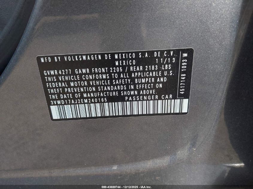 2014 VOLKSWAGEN JETTA 2014 року Бензин, 1.8, Передний привод, vin - 3VWD17AJ2EM240165 из США