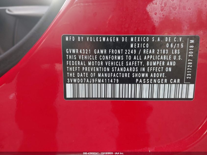 2015 VOLKSWAGEN JETTA 2015 року Бензин, 1.8, Передний привод, vin - 3VWD07AJ9FM411479 из США