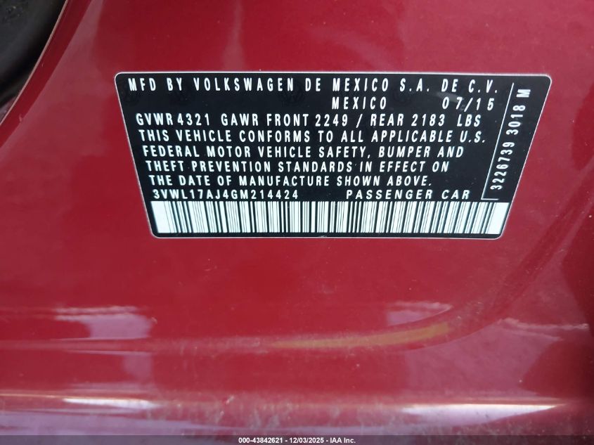 2016 VOLKSWAGEN JETTA 2016 року Бензин, 1.8, Передний привод, vin - 3VWL17AJ4GM214424 из США