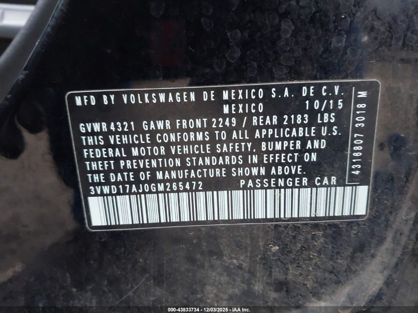 2016 VOLKSWAGEN JETTA S