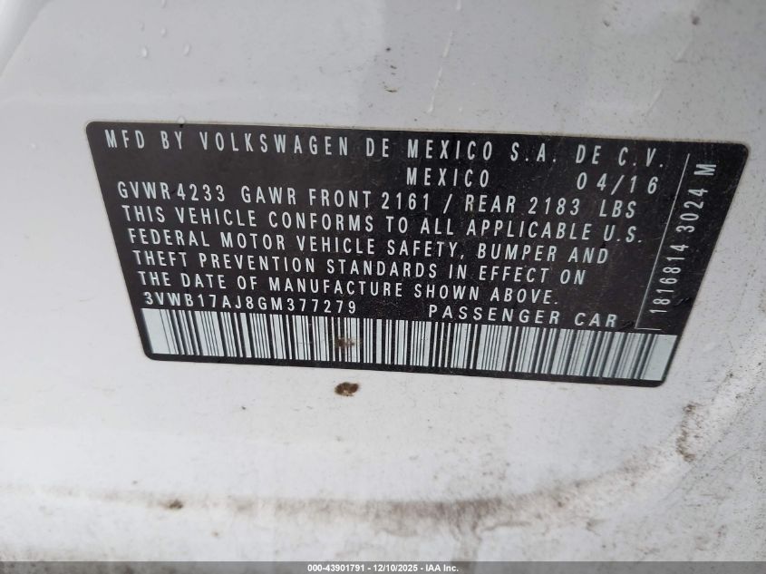 2016 VOLKSWAGEN JETTA 2016 року Бензин, 1.8, Передний привод, vin - 3VWB17AJ8GM377279 из США