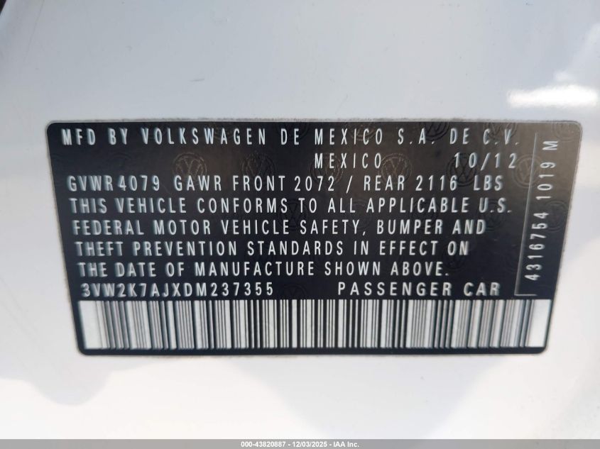 2013 VOLKSWAGEN JETTA 2013 року Бензин, 2.0, Передний привод, vin - 3VW2K7AJXDM237355 из США