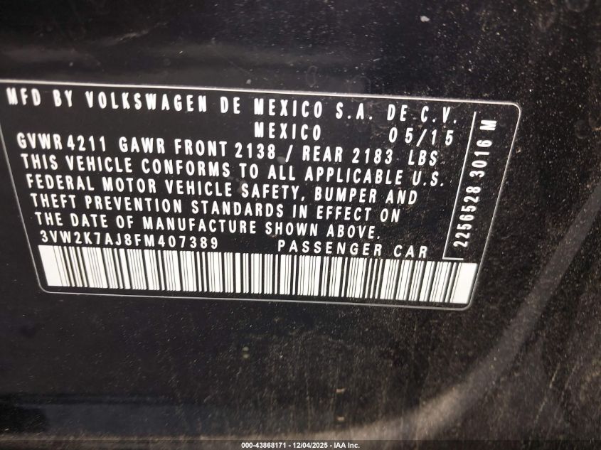 2015 VOLKSWAGEN JETTA 2015 року Бензин, 2.0, Передний привод, vin - 3VW2K7AJ8FM407389 из США