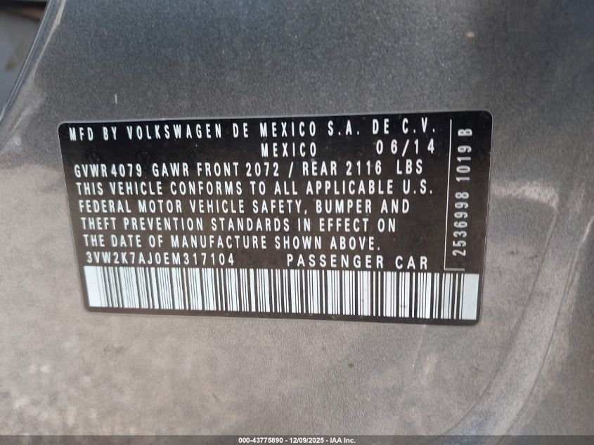 2014 VOLKSWAGEN JETTA 2014 року Бензин, 2.0, Передний привод, vin - 3VW2K7AJ0EM317104 из США