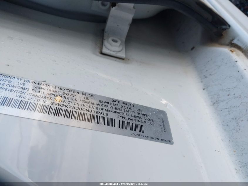 2012 VOLKSWAGEN JETTA 2012 року Бензин, 2.0, Передний привод, vin - 3VW2K7AJ0CM316919 из США