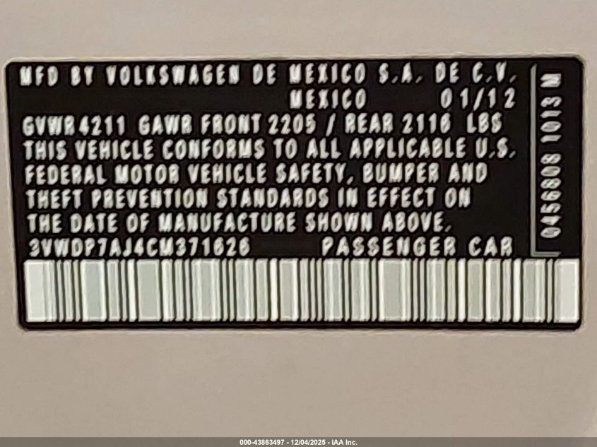 2012 VOLKSWAGEN JETTA 2012 року Бензин, 2.5, Передний привод, vin - 3VWDP7AJ4CM371626 из США
