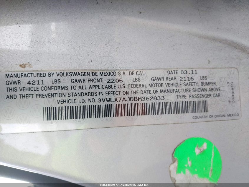 2011 VOLKSWAGEN JETTA 2011 року Бензин, 2.5, Передний привод, vin - 3VWLX7AJ5BM362833 из США