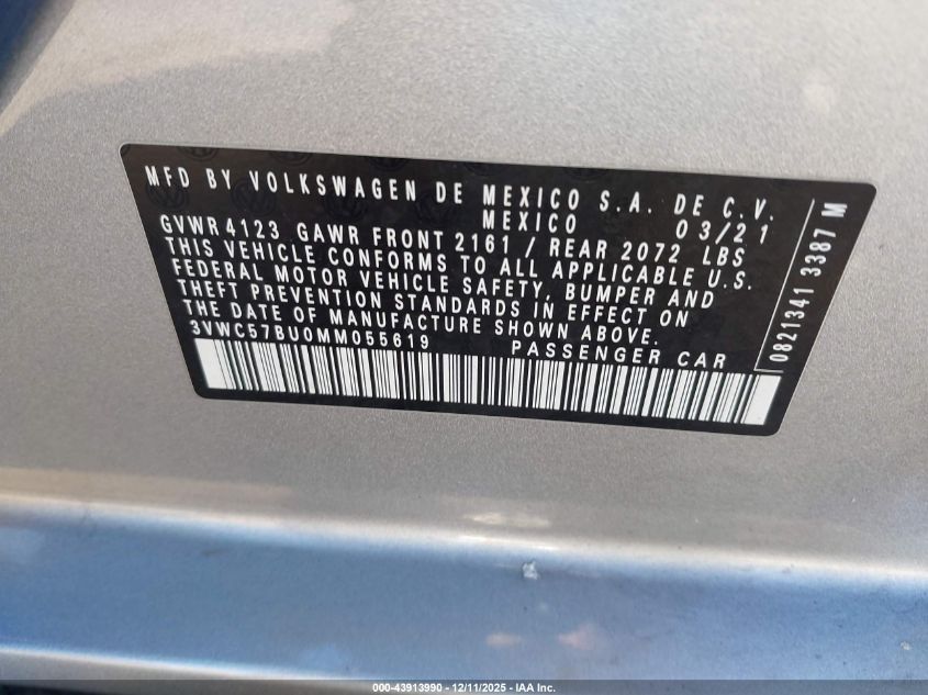 2021 VOLKSWAGEN JETTA 2021 року Бензин, 1.4, Передний привод, vin - 3VWC57BU0MM055619 из США