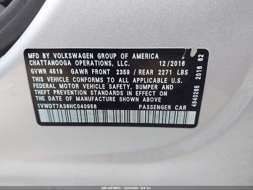 2017 VOLKSWAGEN PASSAT 2017 року Бензин, 1.8, Передний привод, vin - 1VWDT7A36HC040956 из США