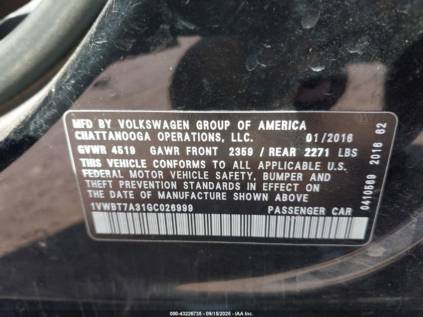 2016 VOLKSWAGEN PASSAT 2016 року Бензин, 1.8, Передний привод, vin - 1VWBT7A31GC026999 из США