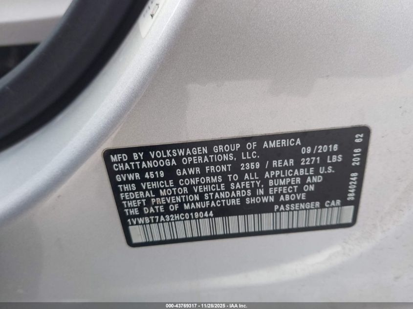 2017 VOLKSWAGEN PASSAT 2017 року Бензин, 1.8, Передний привод, vin - 1VWBT7A32HC019044 из США