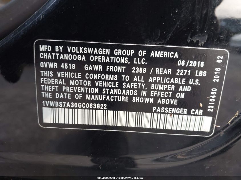 2016 VOLKSWAGEN PASSAT S