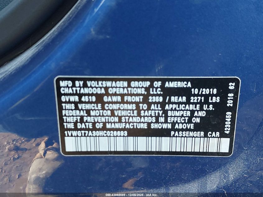 2017 VOLKSWAGEN PASSAT 2017 року Бензин, 1.8, Передний привод, vin - 1VWGT7A30HC026693 из США