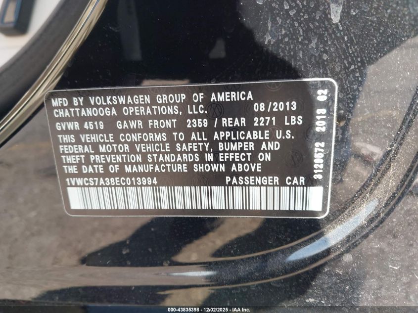 2014 VOLKSWAGEN PASSAT 2014 року Бензин, 1.8, Передний привод, vin - 1VWCS7A38EC013994 из США