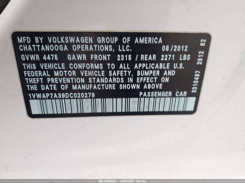 2013 VOLKSWAGEN PASSAT 2013 року Бензин, 2.5, Передний привод, vin - 1VWAP7A39DC020279 из США