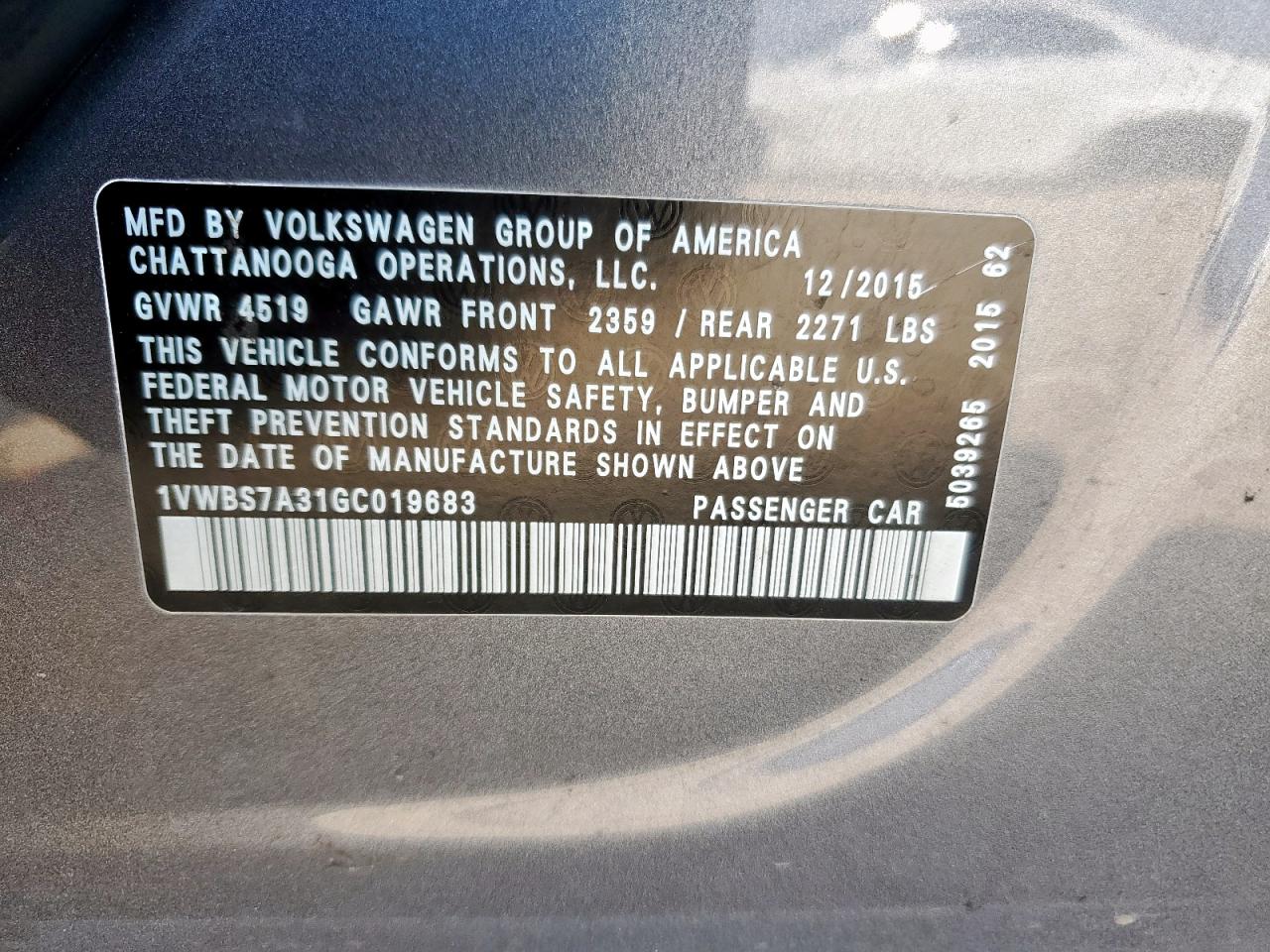 2016 VOLKSWAGEN PASSAT S