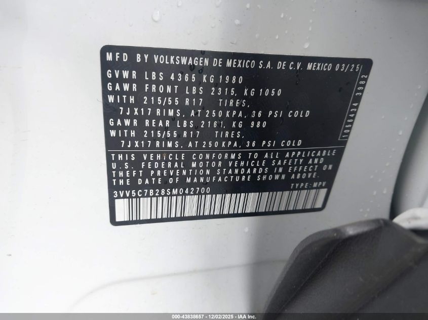 2025 VOLKSWAGEN TAOS 2025 року Бензин, 1.5, Передний привод, vin - 3VV5C7B28SM042700 из США