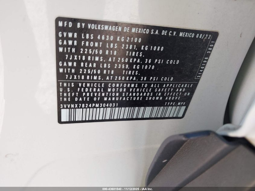 2023 VOLKSWAGEN TAOS 2023 року Бензин, 1.5, Полный привод, vin - 3VVNX7B24PM304031 из США
