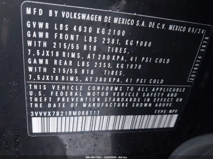 2024 VOLKSWAGEN TAOS 2024 року Бензин, 1.5, Полный привод, vin - 3VVVX7B21RM088111 из США
