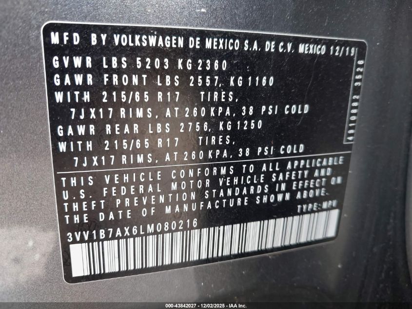 2020 VOLKSWAGEN TIGUAN 2020 року Бензин, 2.0, Передний привод, vin - 3VV1B7AX6LM080216 из США