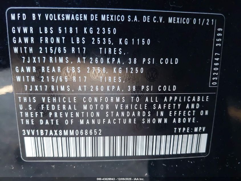 2021 VOLKSWAGEN TIGUAN 2021 року Бензин, 2.0, Передний привод, vin - 3VV1B7AX8MM068652 из США