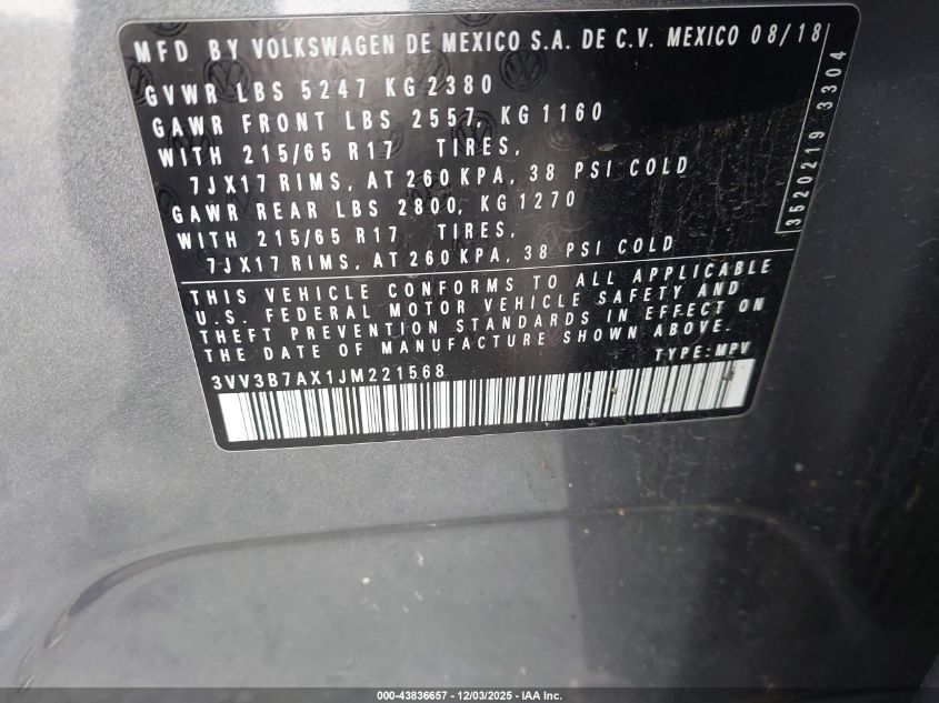 2018 VOLKSWAGEN TIGUAN 2018 року Бензин, 2.0, Передний привод, vin - 3VV3B7AX1JM221568 из США