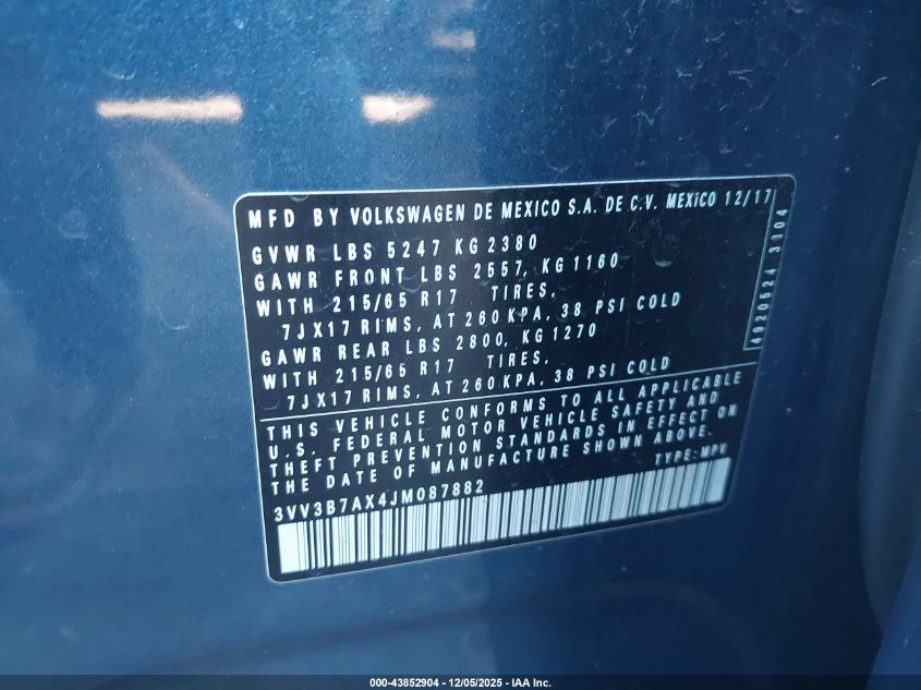 2018 VOLKSWAGEN TIGUAN 2018 року Бензин, 2.0, Передний привод, vin - 3VV3B7AX4JM087882 из США