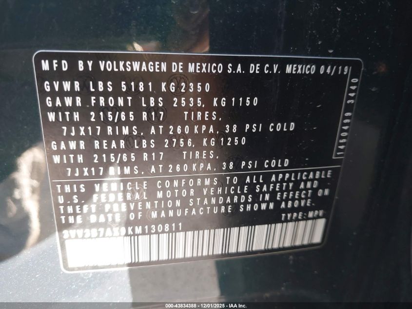 2019 VOLKSWAGEN TIGUAN 2019 року Бензин, 2.0, Передний привод, vin - 3VV3B7AX9KM130811 из США