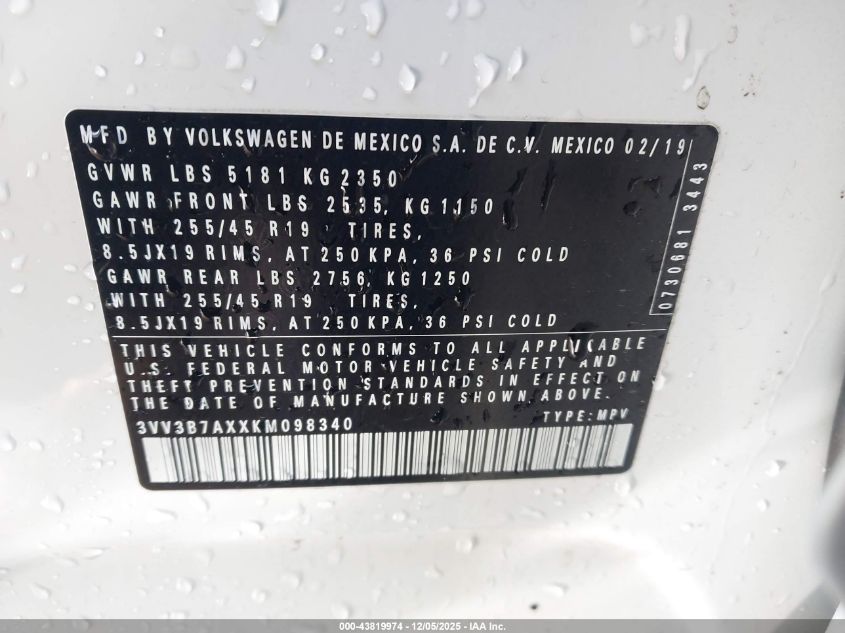 2019 VOLKSWAGEN TIGUAN 2019 року Бензин, 2.0, Передний привод, vin - 3VV3B7AXXKM098340 из США