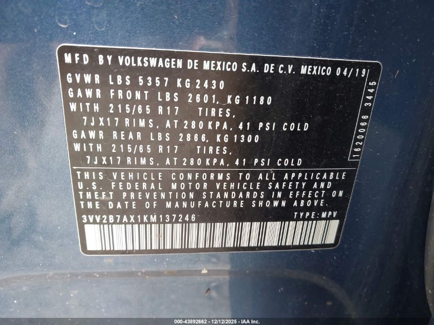 2019 VOLKSWAGEN TIGUAN S