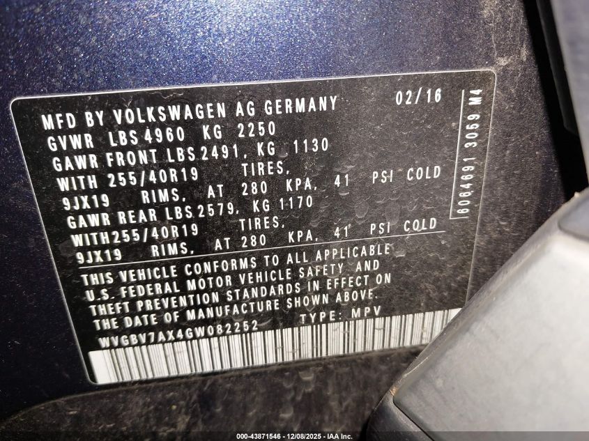2016 VOLKSWAGEN TIGUAN 2016 року Бензин, 2.0, Полный привод, vin - WVGBV7AX4GW082252 из США