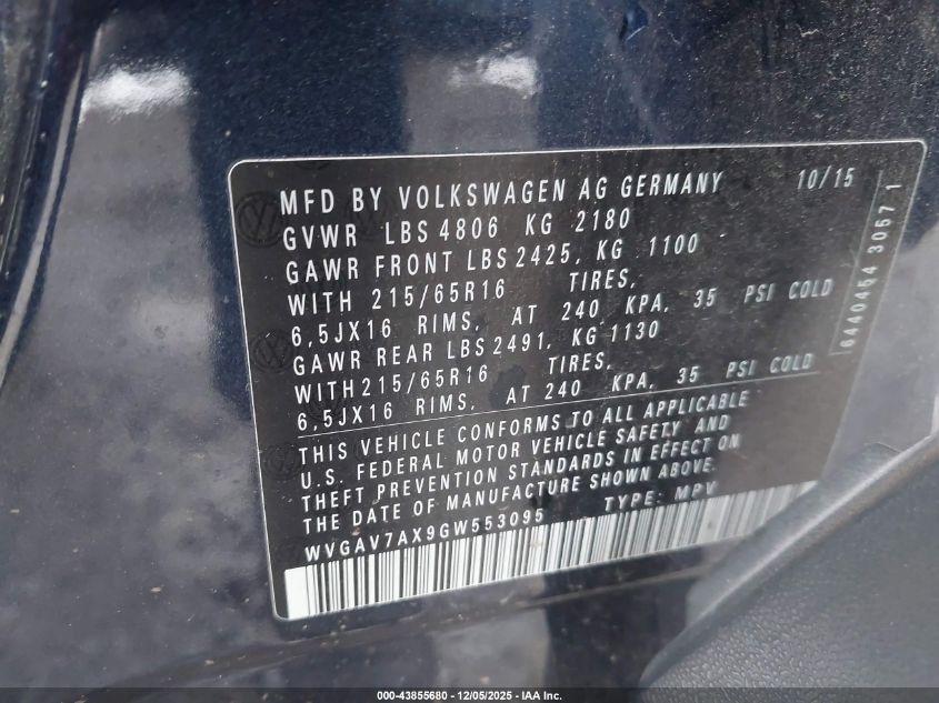 2016 VOLKSWAGEN TIGUAN 2016 року Бензин, 2.0, Передний привод, vin - WVGAV7AX9GW553095 из США