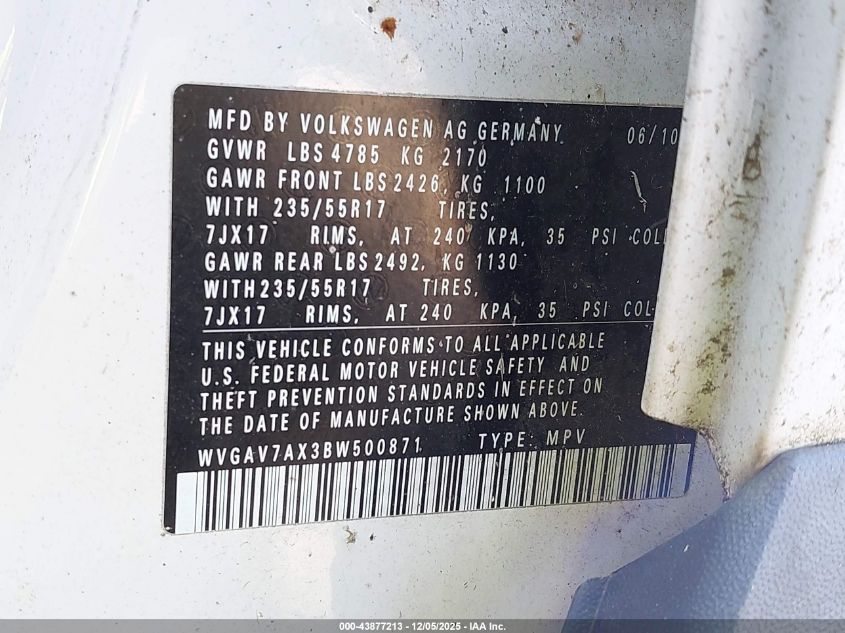 2011 VOLKSWAGEN TIGUAN 2011 року Бензин, 2.0, Передний привод, vin - WVGAV7AX3BW500871 из США