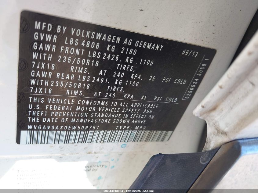 Цвет БелыйЦилиндры 4Привод Передний приводVIN WVGAV3AX0EW509797Состояние Заводится и едет (проверено)Повреждения Неизвестно AutoRIA