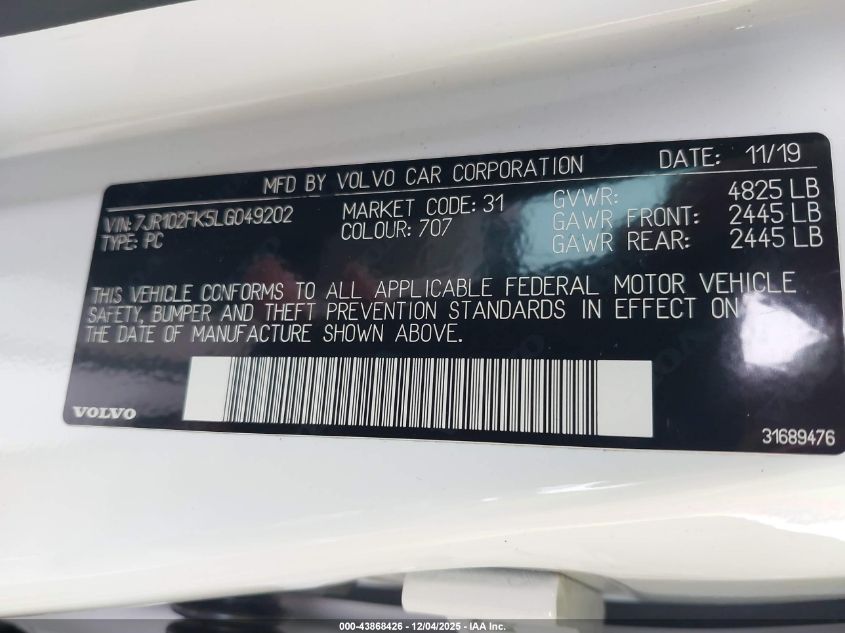 2020 VOLVO S60 2020 року Бензин, 2.0, Передний привод, vin - 7JR102FK5LG049202 из США