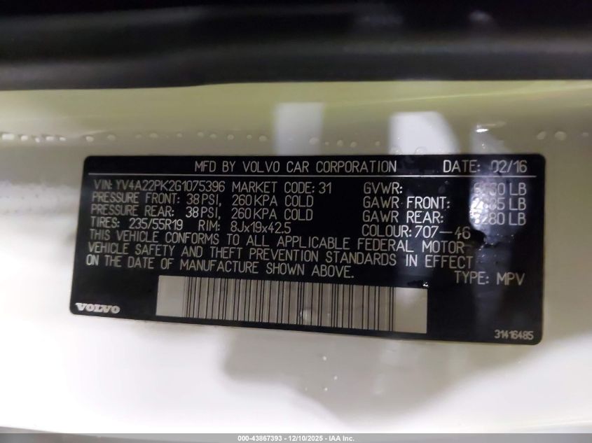 2016 VOLVO XC90 2016 року Бензин, 2.0, Полный привод, vin - YV4A22PK2G1075396 из США
