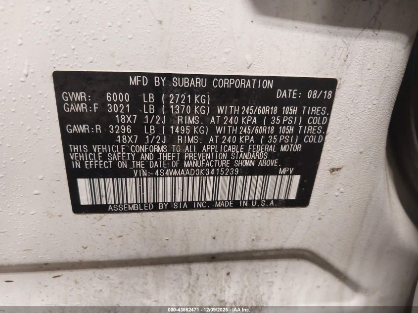 2019 SUBARU ASCENT 2019 року Бензин, 2.4, Повний привід, vin - 4S4WMAAD0K3415239 з США