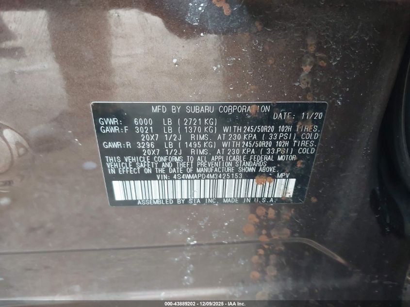2021 SUBARU ASCENT 2021 року Бензин, 2.4, Повний привід, vin - 4S4WMAPD4M3425153 з США