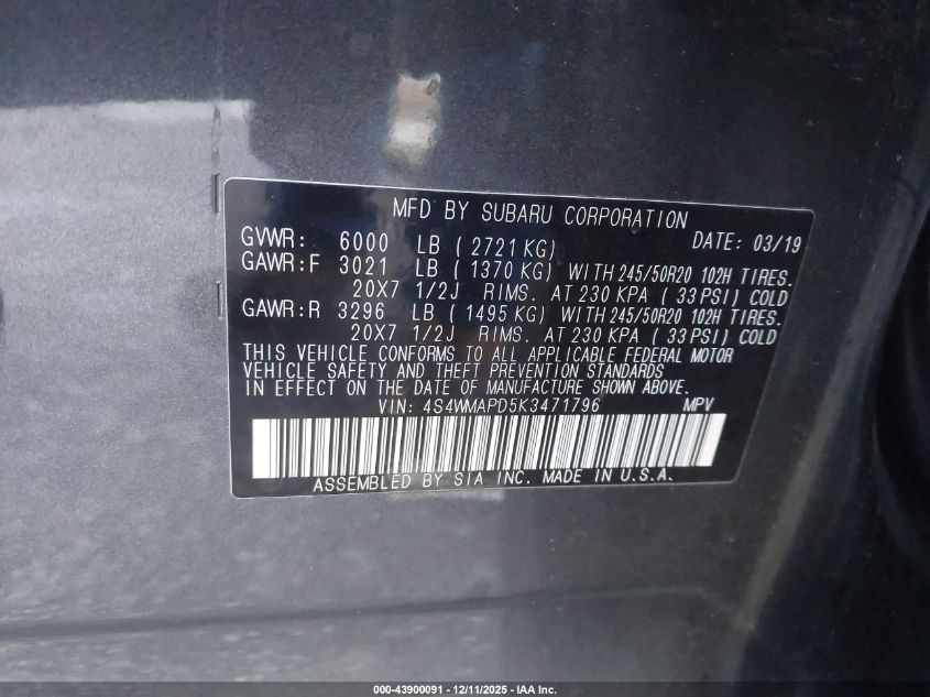 2019 SUBARU ASCENT 2019 року Бензин, 2.4, Повний привід, vin - 4S4WMAPD5K3471796 з США
