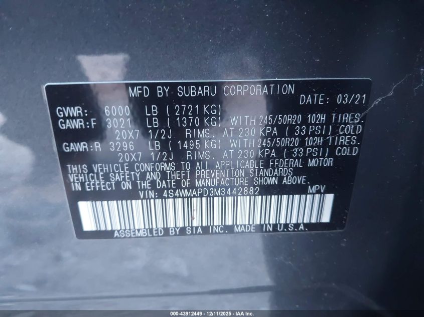 2021 SUBARU ASCENT 2021 року Бензин, 2.4, Повний привід, vin - 4S4WMAPD3M3442882 з США