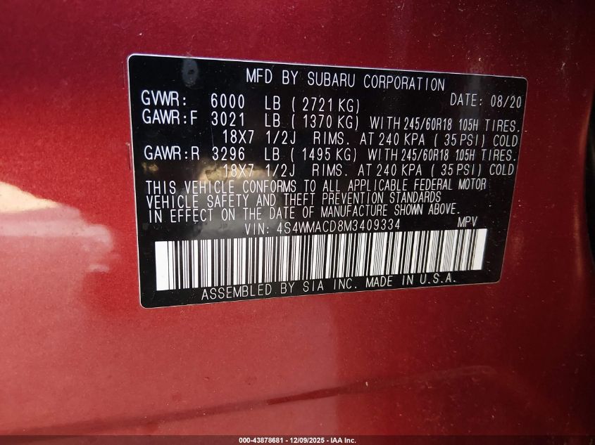 2021 SUBARU ASCENT 2021 року Бензин, 2.4, Повний привід, vin - 4S4WMACD8M3409334 з США