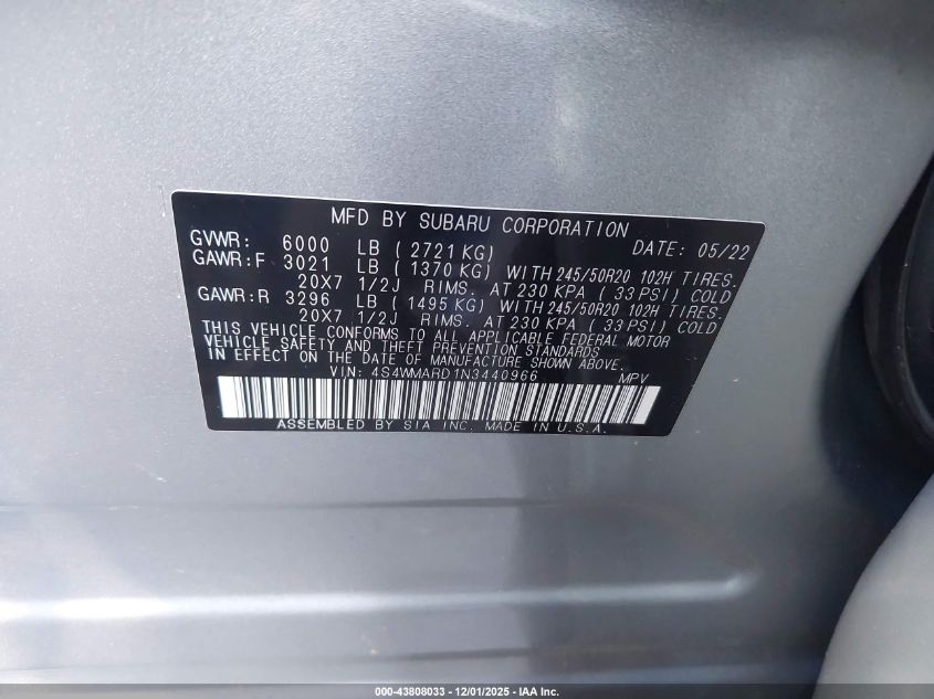 2022 SUBARU ASCENT 2022 року Бензин, 2.4, Повний привід, vin - 4S4WMARD1N3440966 з США