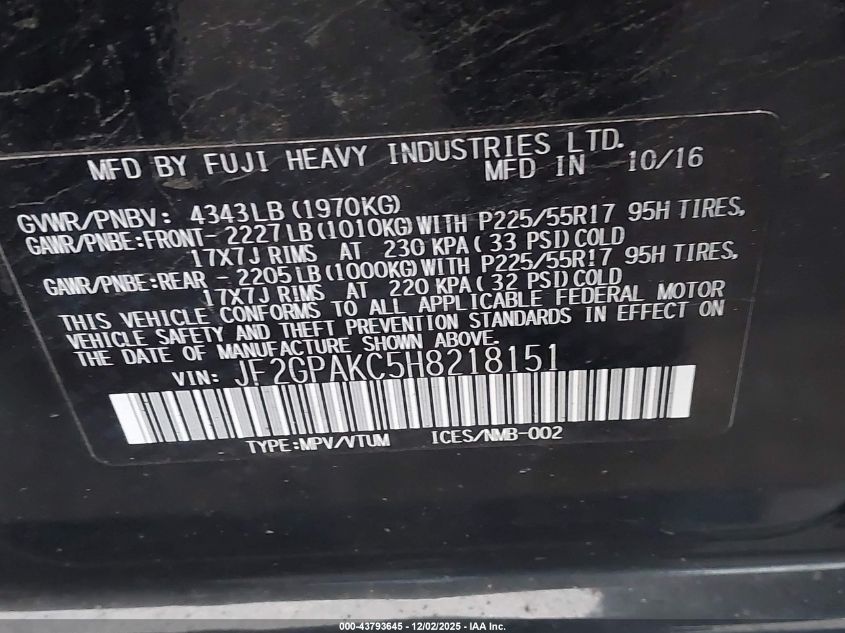 2017 SUBARU CROSSTREK 2017 року Бензин, 2.0, Повний привід, vin - JF2GPAKC5H8218151 з США