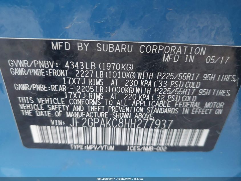 Колір СинійЦиліндри 4Привід Повний привідVIN JF2GPAKC8HH277937Стан Заводиться та їде (перевірено)Ушкодження Передня і задня Дата аукціону 2025-12-18 AutoRIA