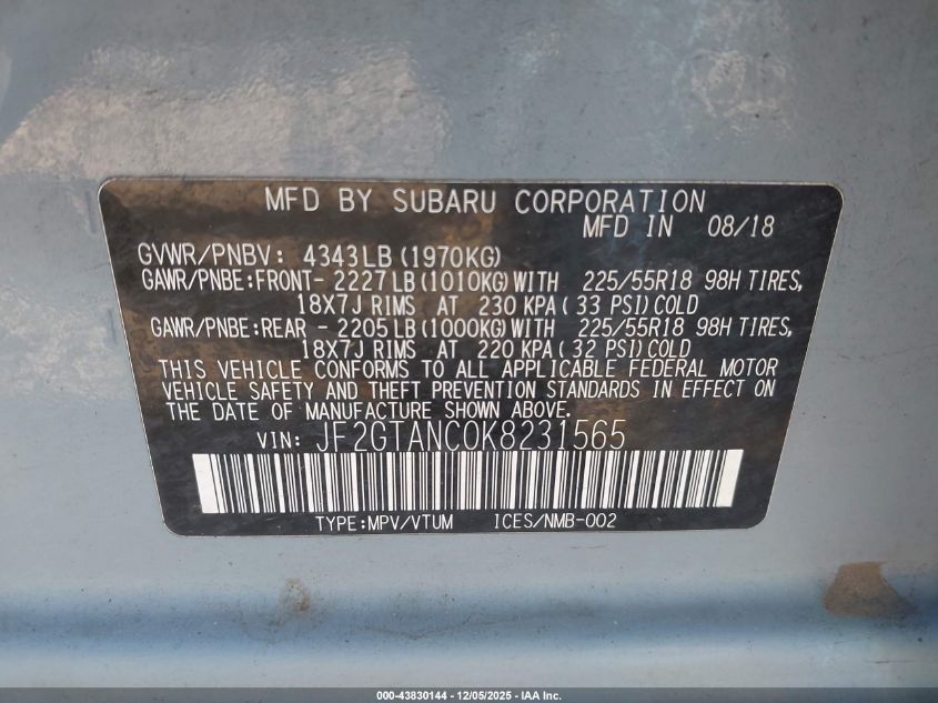 2019 SUBARU CROSSTREK 2019 року Бензин, 2.0, Повний привід, vin - JF2GTANC0K8231565 з США