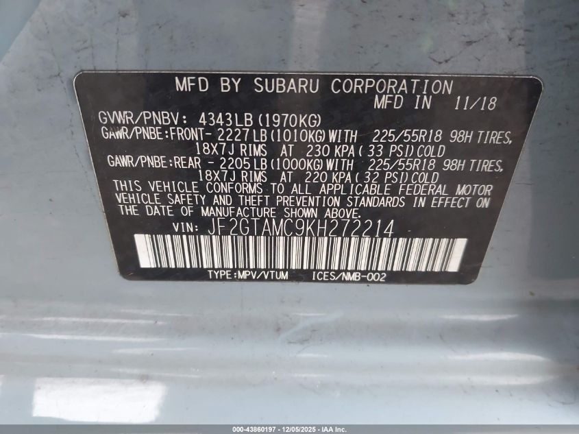 2019 SUBARU CROSSTREK 2019 року Бензин, 2.0, Повний привід, vin - JF2GTAMC9KH272214 з США