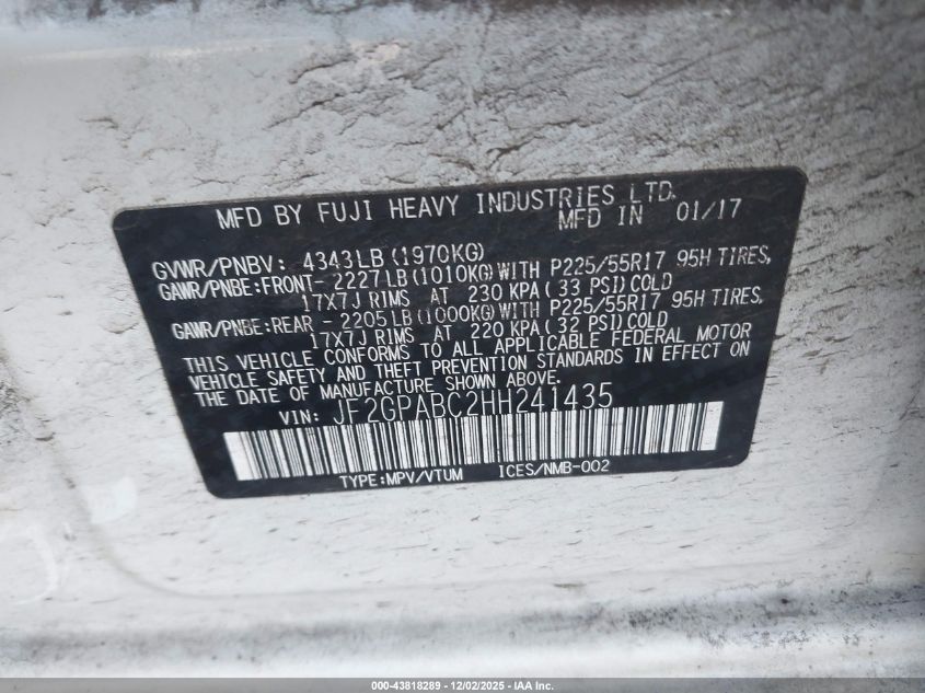 2017 SUBARU CROSSTREK 2017 року Бензин, 2.0, Повний привід, vin - JF2GPABC2HH241435 з США