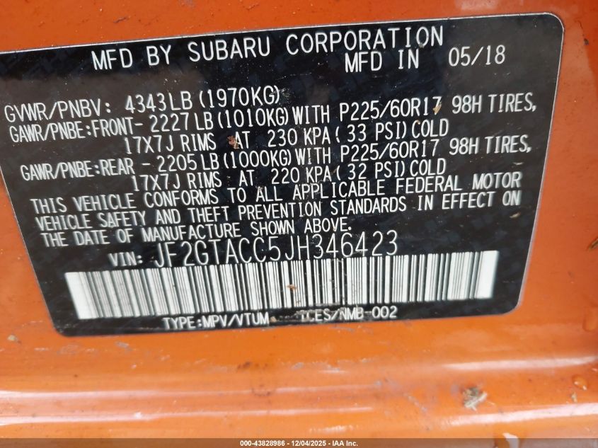 2018 SUBARU CROSSTREK 2018 року Бензин, 2.0, Повний привід, vin - JF2GTACC5JH346423 з США