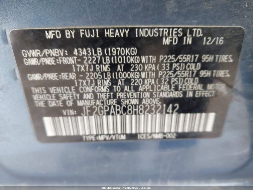 2017 SUBARU CROSSTREK 2017 року Бензин, 2.0, Повний привід, vin - JF2GPABC8H8232142 з США