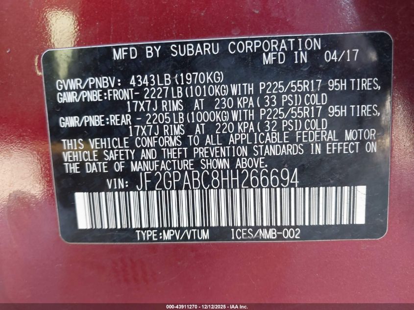 2017 SUBARU CROSSTREK 2017 року Бензин, 2.0, Повний привід, vin - JF2GPABC8HH266694 з США